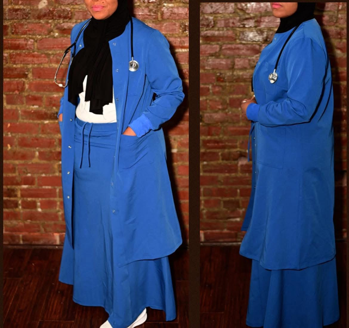 2pcs knee length scrub set with skirt and long lab coat cover up. Lab jackets are NOT made to close/ button up